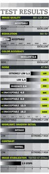 When you look at resolution at those ISOs, however, you can see why. At ISO 800, TIFFs converted using the default noise reduction yielded 1640 lines, while JPEGs converted in camera turned in 1520 lines. At ISO 6400, TIFFs resolved 1480 lines; JPEGs fell to 1225 lines. (Experimenting with NR during RAW conversion can balance noise against resolution—if you are willing to do this.)