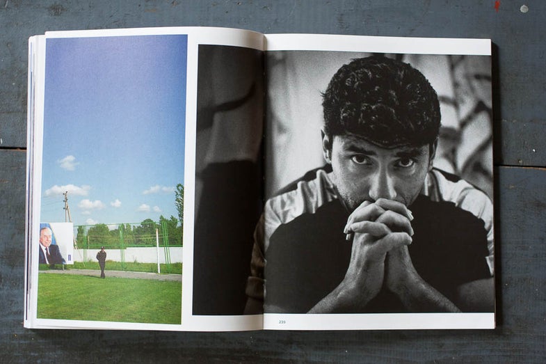 The book is organized around the six lives it describes, and its design features do a lot to drive the overall storytelling. Each section is introduced with a written biography by Huizinga and caption list, with all text printed in English, Armenian and Azerbaijani. The texts are also color-coded to indicate the person’s ethnic heritage (blue for Armenia, red for Azarbaijan). Visser’s photos that follow are also rigidly segmented–with photographs of important places and landscapes in color, and depictions of each person’s daily life in stark black and white. His work is presented alongside personal snapshots from years’ past provided by the subjects. The photos are often broken up across consecutive pages, with no image seen in its entirety on any single page.