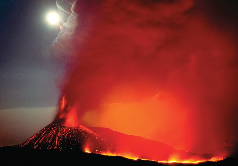 The moon rises over an erupting summit vent in Mt. Etna, Sicily, Italy _ Photo: Art Wolfe_ From: Earth is My Witness