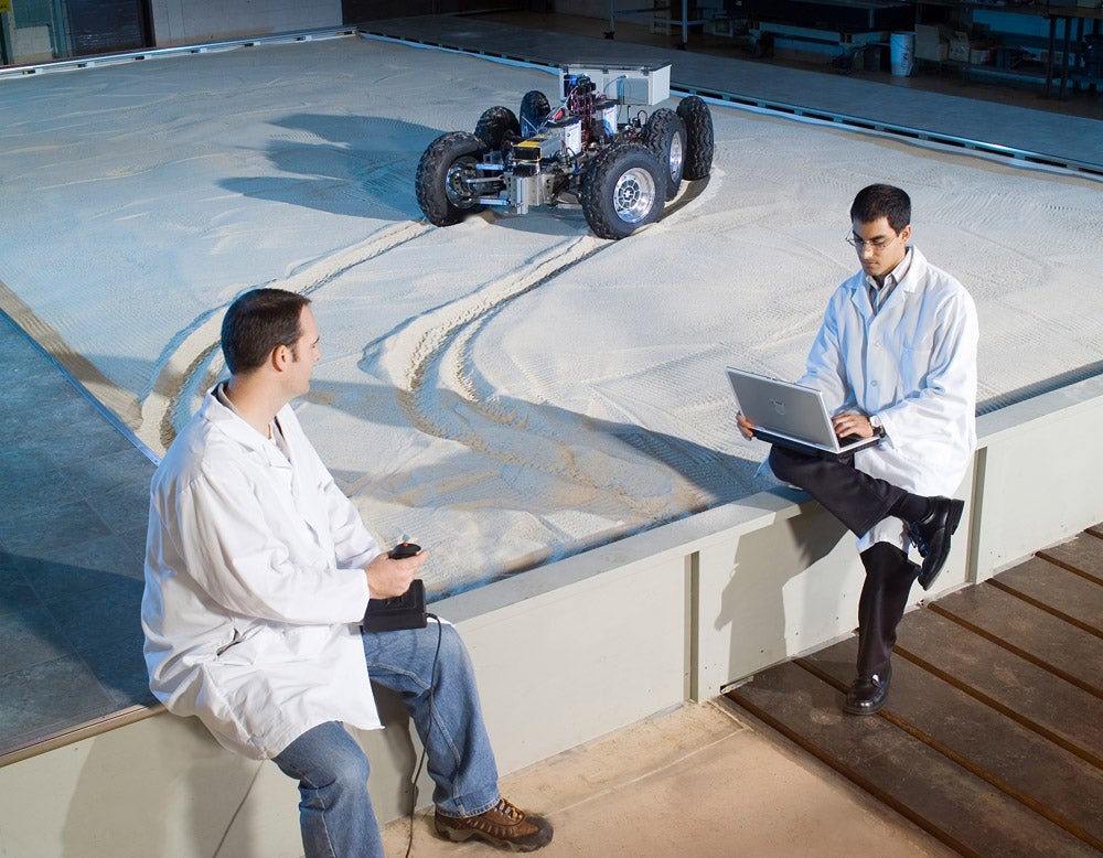 Photo of the Surface Technology Team in the Simulated Lunar Operations Laboratory at NASA Glenn Research Center, 2006 (ISO 160; shutter speed 1/90; F11; Focal Length 35mm). NASA, Michelle M. Murphy