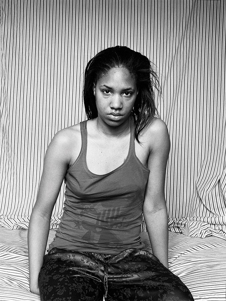LaToya Ruby Frazier “Self Portrait, March (10am),” 2009 In this self-portrait taken during a lupus attack, Frazier poses in her late grandmother’s silk pajama pants in front of a sheet. As in this image, Frazier’s moving work, much of it focused on her family and her post-industrial hometown of Braddock, Pennsylvania, sits at the intersection of the personal and the political. It was recently published in the artist’s first monograph, The Notion of Family (Aperture 2014). © LaToya Ruby Frazier—Michel Rein, Paris/Brussels