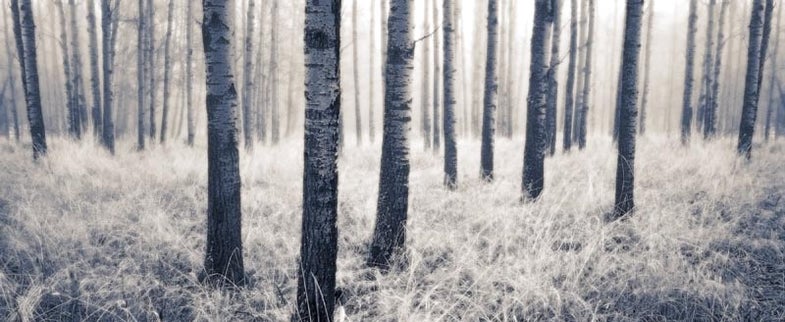 Wiggett shot this forest on Fujichrome Provia 100 in a Hasselblad XPan with 45mm f/4 lens. Scanned, then converted to b&w and toned in Photoshop CS4. Darwin Wiggett